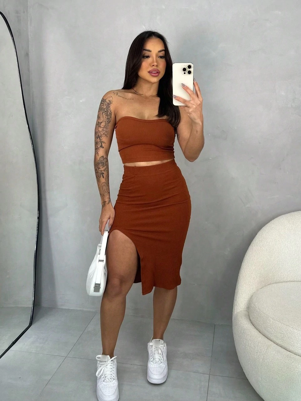 Conjunto Feminino Elegante Cropped Tomara Que Caia Nuvem + Saia Midi Com Fenda