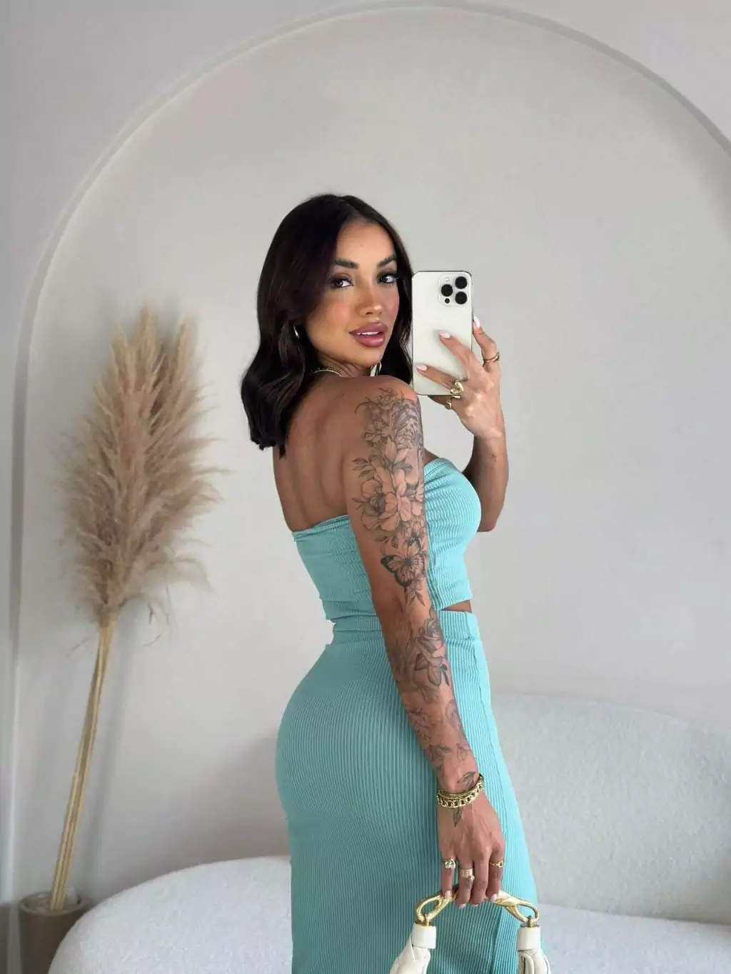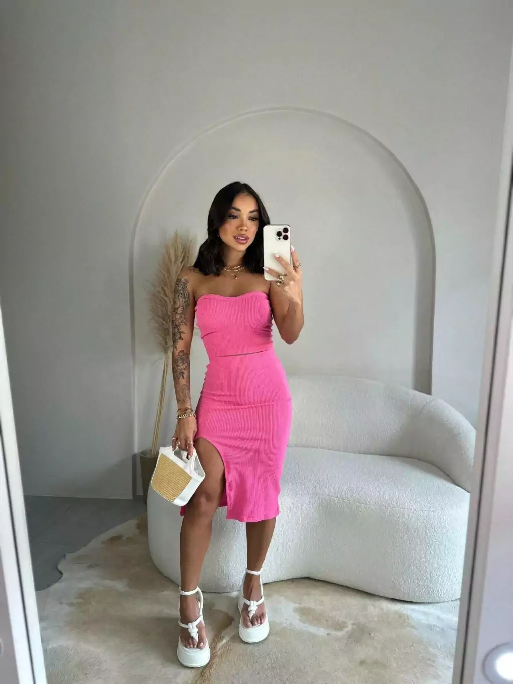 O design do Cropped revela uma silhueta moderna e feminina, proporcionando um visual sofisticado e sedutor. A escolha do tomara que caia adiciona um toque de ousadia, enquanto a Saia Midi, com sua fenda estrategicamente posicionada, eleva a peça a um nível de refinamento incomparável. A combinação dos dois elementos cria um conjunto harmonioso, perfeito para eventos especiais e ocasiões que demandam uma presença marcante.