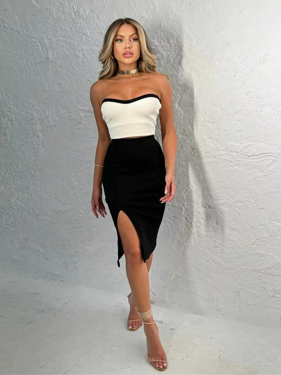 O design do Cropped revela uma silhueta moderna e feminina, proporcionando um visual sofisticado e sedutor. A escolha do tomara que caia adiciona um toque de ousadia, enquanto a Saia Midi, com sua fenda estrategicamente posicionada, eleva a peça a um nível de refinamento incomparável. A combinação dos dois elementos cria um conjunto harmonioso, perfeito para eventos especiais e ocasiões que demandam uma presença marcante.